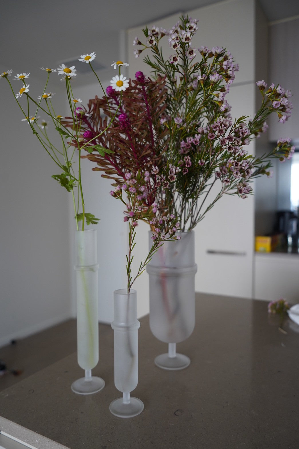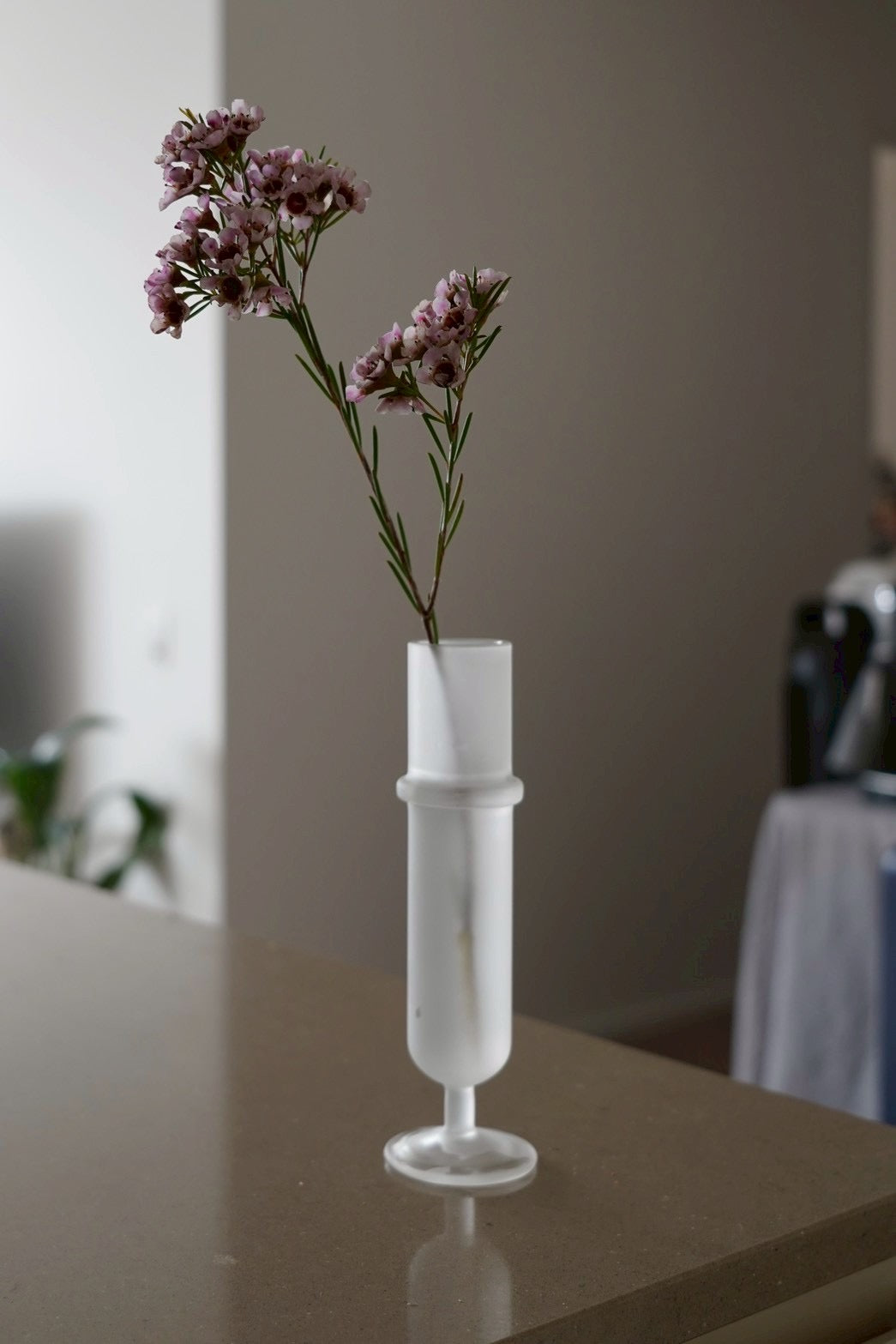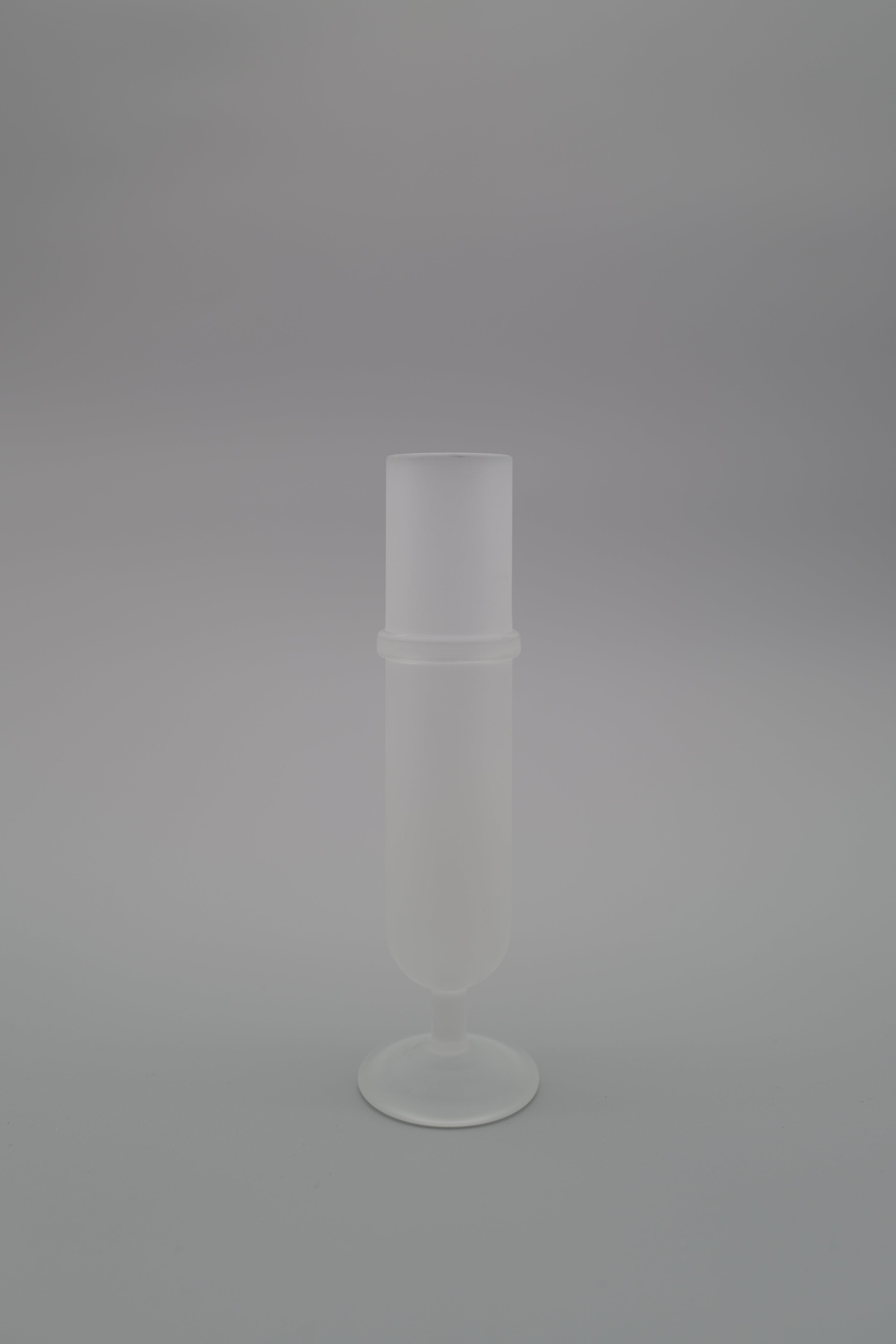 花がいかに美しく見えるかを考え、茎の部分も自然に魅せる花器を作りました。どの空間に置いてもマッチするようにミニマルかつ上品さを兼ね備えたフォルムに仕上 げています。 試験管やフラスコなど理化学製品を製作する東京都江東区のガラス工 場で職人が一つずつ手作りで作り上げています。